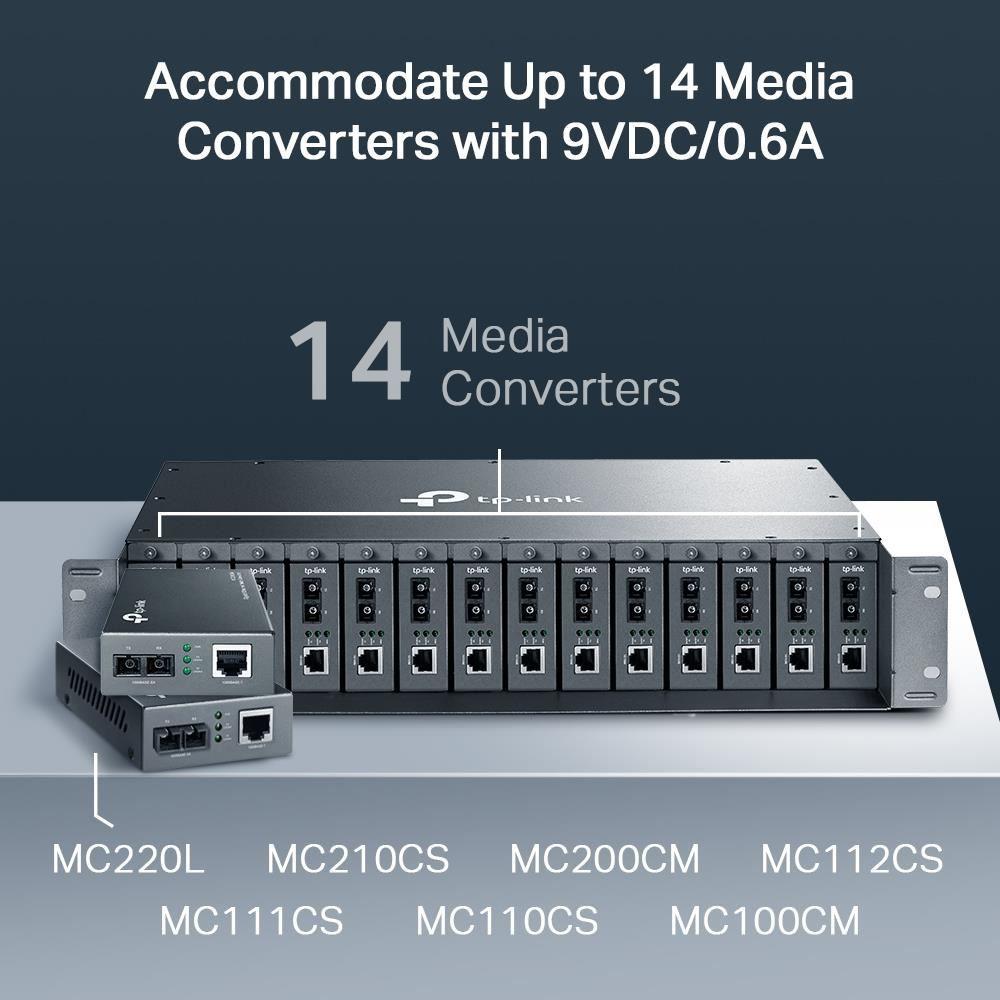 Rackový chassis Omada MC1400 se 14 sloty je speciálně navrženo pro umístění 14 mediálních konvertorů Omada, což umožňuje centrální napájení a šetří místo a kabely. Pro nepřetržitý provoz ve vláknové komunikaci je chassis vybaveno volitelným redundantním napájecím zdrojem a funkcí Hot-Swapping, díky které lze instalovat/odstraňovat konvertory bez vypnutí chassis. K stabilizaci výkonu a prodloužení životnosti jsou uvnitř instalovány dva chladiče. Spolu s mediálními konvertory Omada řady MC Gigabit / Fast Ethernet je MC1400 ideálním řešením pro vaši síť mediální konverze. * Pro tp-link mediální konvertory podporuje MC1400 verze MCXXX ver:2.0 a vyšší, ne verze 1.0. ** MCRP100 lze použít jako modul napájení pro MC1400. Každý MCRP100 je vybaven chladičem.