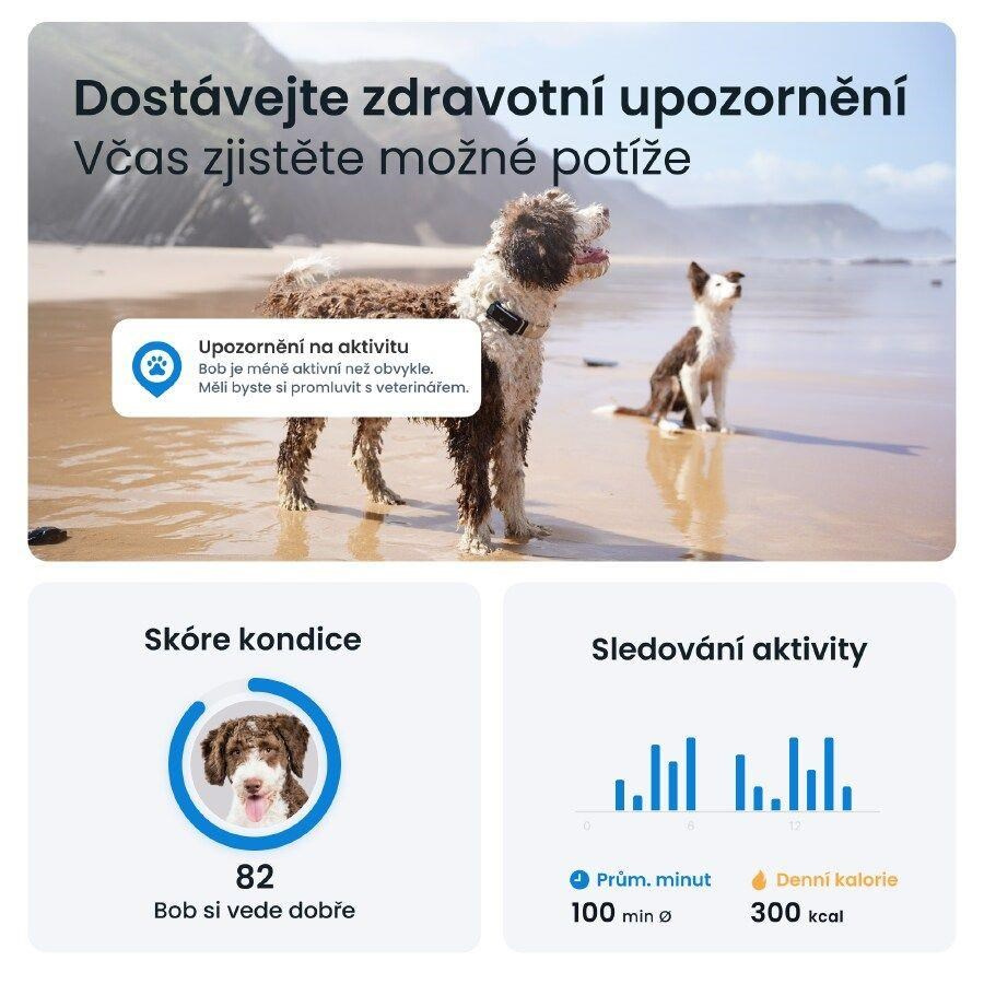GPS tracker Tractive vás informuje, jak moc se váš pes pohybuje, spí a štěká. Můžete nastavit cíle pohybu, kontrolovat Skóre kondice a porovnávat svého psa s jinými plemeny.