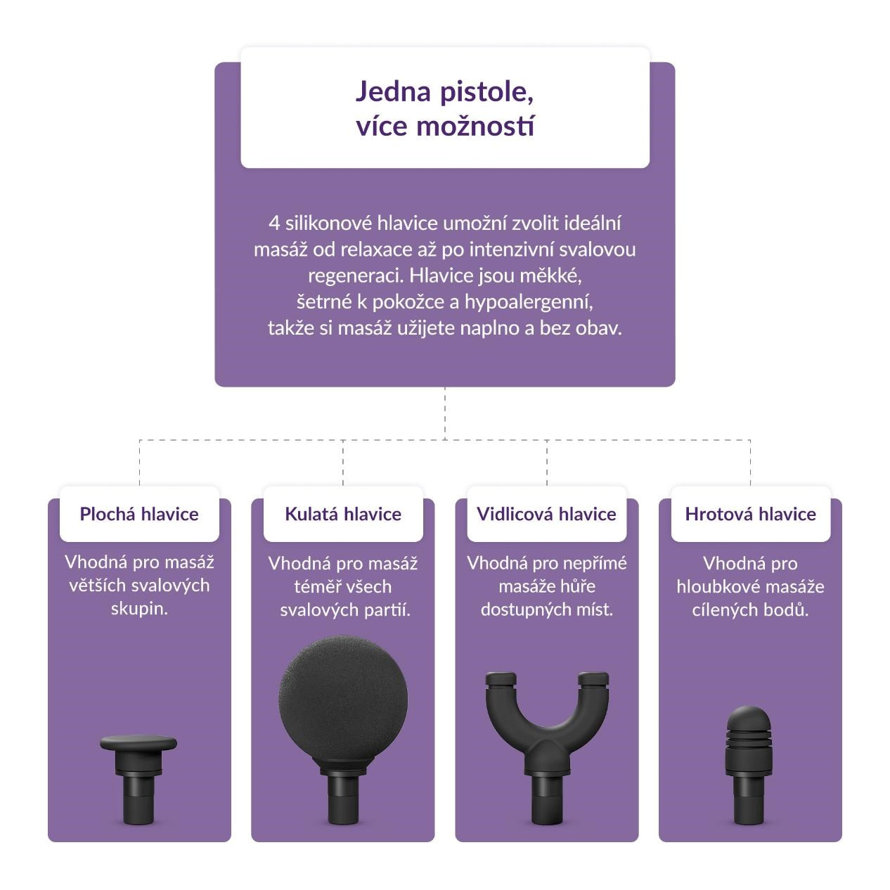 Vyberte si tu pravou. Čtyři unikátní hlavice, které se přizpůsobí každému svalu a každé náladě.