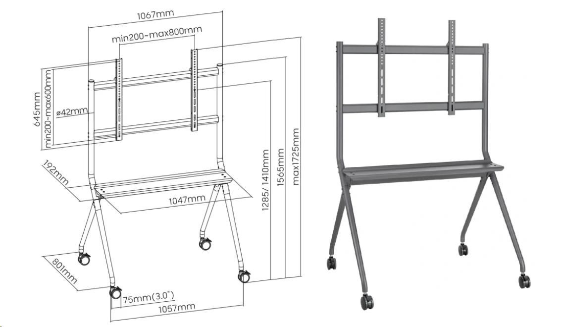 iber Mounts M9C77: Stojan na Tv 50" - 90", nastavení výšky středu Tv od podlahy 1285-1410 mm, polička 1047x192 mm, kolečka 75 mm s aretací, VESA standardy 200x100 až 800x600, nosnost 100 kg Podlahový stojan pro profesionály na jejich prezentace a přednášky, vhodný taktéž do učebny pro zobrazovací zařízení nebo dotykové obrazovky. Ideální pro zavěšení televizoru, monitoru nebo displeje s úhlopříčkou 50" až 90". Stojan Fiber Mounts M9C77podporuje VESA standardy 200x100 až 800x600 a bezpečně unese zařízení s hmotností až 100 kg. Minimální potřebný prostor na podlaze pro umístění stojanu je 1100x850 mm. Výšku obrazovky je možné nastavit od 1285 mm do 1410 mm (od podlahy po střed obrazovky). Stojan je osazen poličkou s rozměry 1047x192 mm. Barevné provedení černé. Záruka 3 roky. Podlahový stojan pro zavěšení televize, pojízdný, nastavení výšky, ideální na přednášky a prezentace Fiber Mounts M9C77 Technické údaje Tv stajanu Fiber Mounts M9C77: nosnost 100 kg pro zavěšení Tv, monitoru, displeje, dotykové obrazovky 50" - 90" podporuje VESA standardy 200x100 až 800x600 nastavitelná výška obrazovky 1285-1410 mm (od podlahy po střed obrazovky) polička 1047x192 mm, nosnost 10 kg pojezdová kolečka o průměru 75 mm s aretací (brzda pro zajištění proti pohybu) potřebný minimální prostor na podlaze 1100x850 mm kvalitní kovová konstrukce barevné provedení černé záruka 3 roky Televizní stojan mobilní s poličkou a nastavením výšky obrazovky Fiber Mounts M9C77 Tv stojan Fiber Mounts M9C77 podporuje VESA standardy pro uchycení: VESA 200x100 VESA 200x200 VESA 300x200 a 200x300 VESA 300x300 VESA 400x200 a 200x400 VESA 400x300 a 300x400 VESA 400x400 VESA 500x200 VESA 500x300 VESA 500x400 VESA 500x500 VESA 600x300 VESA 600x400 VESA 600x500 a 500x600 VESA 600x600 VESA 700x300 VESA 700x400 VESA 700x500 VESA 700x600 VESA 800x400 VESA 800x500 VESA 800x600. , ,