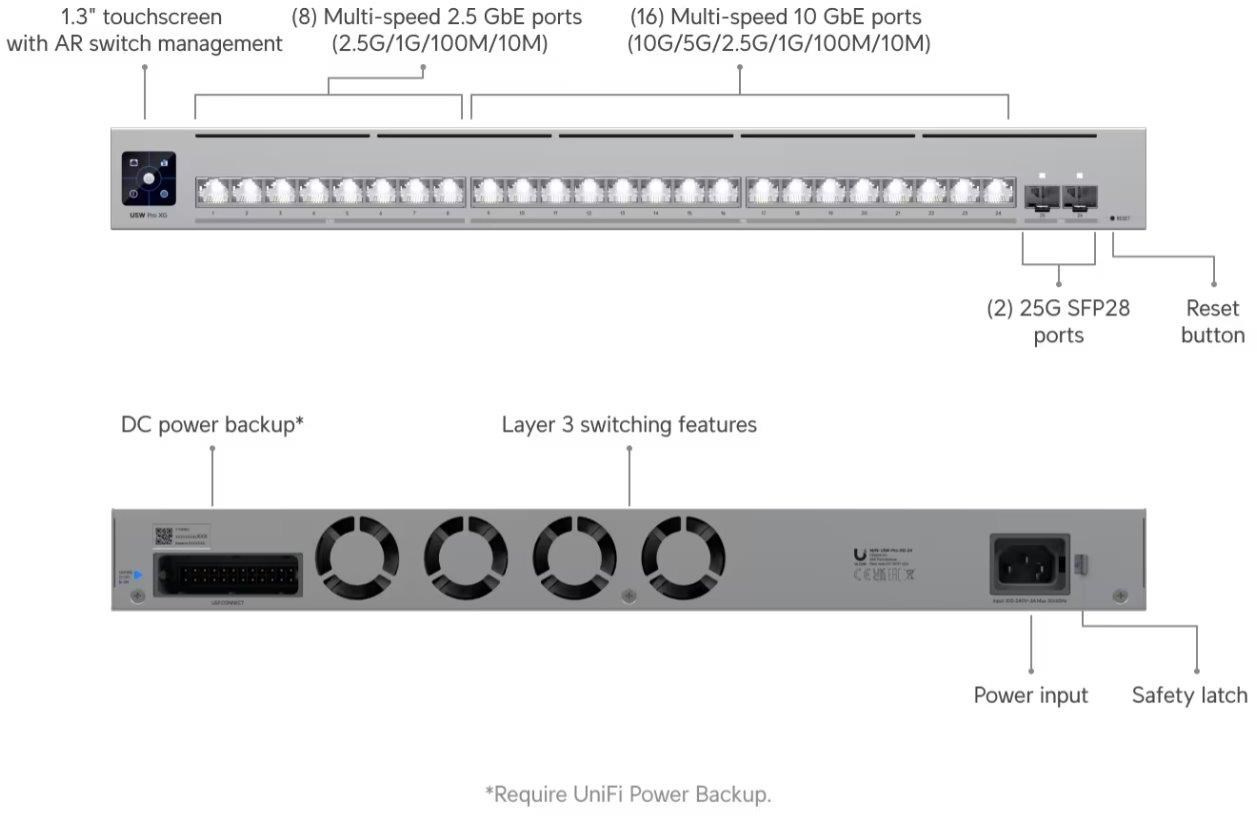 Popis produktu UniFi Switch USW-Pro-XG-24 je managovatelný L3 Switch s kapacitou přepínání 460 Gbps, (16) 2.5-Gigabit LAN, (32) 10-Gigabit LAN porty a (4) SFP28 (25G/10G/1G) porty. Ethernetové porty disponují funkcí Etherlighting, která Vám umožňuje barevně rozsvěcet porty pro zobrazení umístění portu, rychlosti/připojení a VLAN. Switch se napájí ze sítě 230V AC a jako záloha pro případ selhání primárního napájení slouží USP RPS DC port. Maximální spotřeba je 250W. Klíčové vlastnosti • (16) 2.5G portů • (32) 10G portů • (4) 25/10/1G SFP28 porty • Etherlighting - světelné zobrazení informací o portu • Montáž do racku • Správa pomocí UniFi Network Server Správa přes UniFi Network server USW-Pro-XG-24 nemá webový management ale je spravován centrálně pomocí UniFi Network Server s podporou mobilní aplikace UniFi a nabízí rozsáhlou sadu pokročilých přepínacích protokolů a funkcí L2 a L3, včetně provozního režimu (přepínání, zrcadlení nebo agregace) na port. UniFi Network Server a mobilní aplikace umožňují správcům konfigurovat a sledovat prakticky všechny funkce přepínače v grafickém uživatelském rozhraní odkudkoli. Obsah balení • Zařízení • Napájecí kabel • Úchyty do racku Technické parametry Konektory a rozhraní Rychlost LAN:(16) 2.5G/1G/100M/10M + (32) 10G/5G/2.5G/1G/100M/10M Optické rozhraní:(4) 1/10/25Gbps Ostatní:Dotykový displej Napájení Typ napájení:Ze sítě (230V) Redundantní napájení:Ano Max. spotřeba energie [W]:250 Napájení přes konektor/svorkovnici:230V AC Fyzické charakteristiky Provedení:Rackmount Ventilátory:Ano Šasi:Kovové Tlačítka:Reset Provozní teplota [°C]:-5 až 40 Šířka [mm]:442 Výška [mm]:44 Hloubka [mm]:480 Obecné Rychlost přepínání [Gbps]:920 Tabulka MAC adres:128000 Rychlost předávání paketů [Mpps]:684 Software Management:UniFi Network Funkce:VLAN, DHCP snooping, L2, L3 Výchozí IP adresa:192.168.1.20, Dynamická z DHCP Výchozí jméno a heslo:ubnt / ubnt. , ,