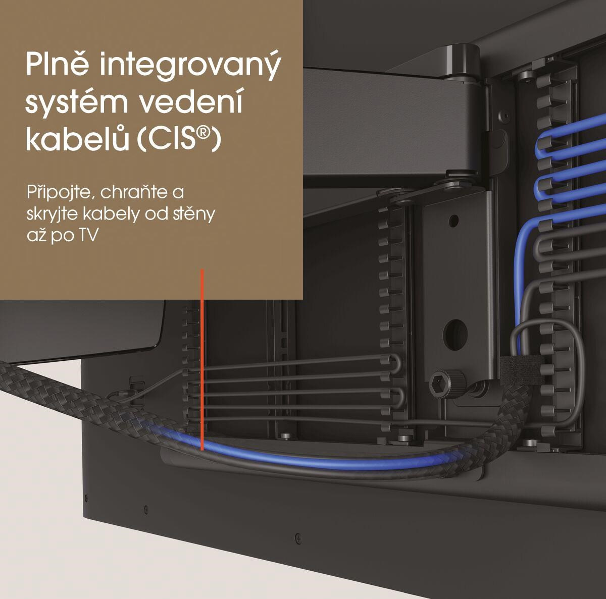 Pokud se snažíte o čistý a minimalistický design, nechcete mít žádné kabely na očích. Proto je TVM 7655 vybaven systémem uložení kabelů (CIS®). Tento systém vede kabely od stěny k televizoru skrz nosná ramena. Díky integrovaným držákům kabelů s krycí lištou můžete tak elegantně skrýt téměř 4 metry kabelů na zadní straně televizoru. Nechat kabely zmizet ve zdi je snadné díky otvoru v nástěnné desce TV držáku.