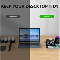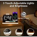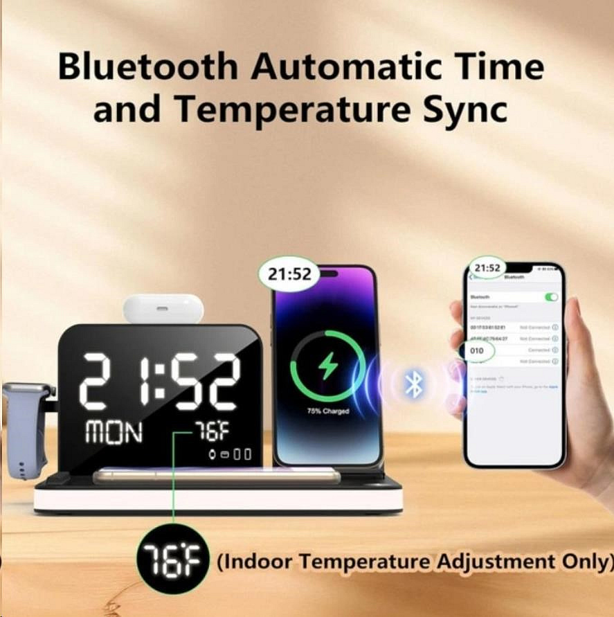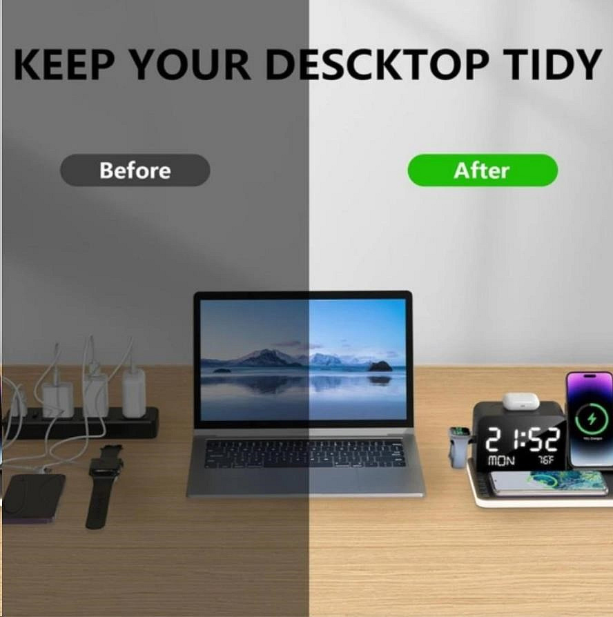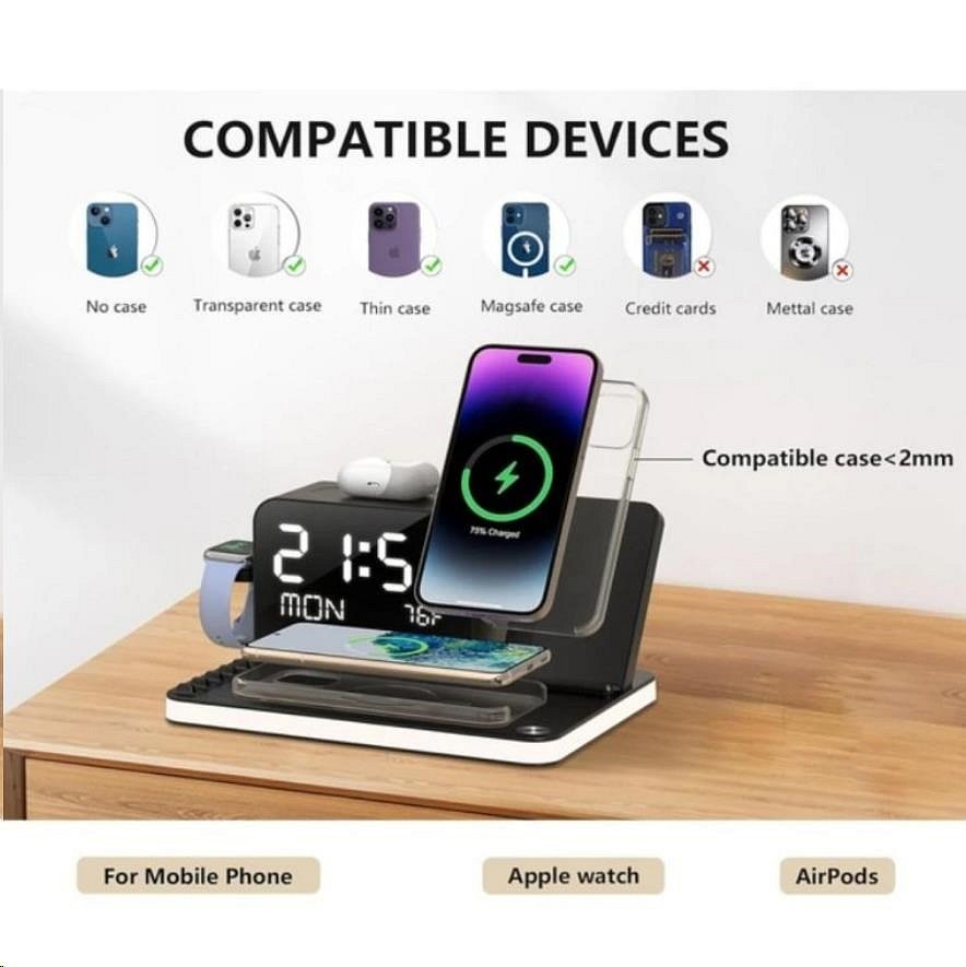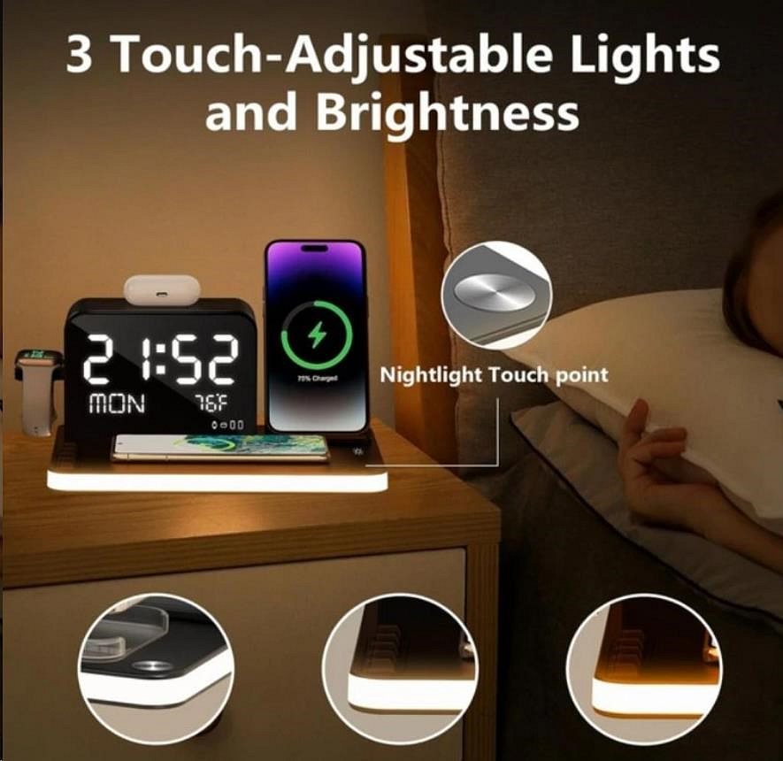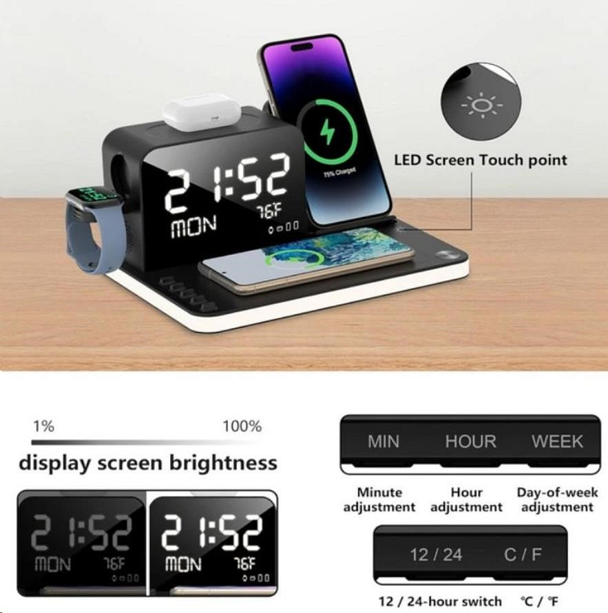Hlavní výhody: Rychlé bezdrátové nabíjení iPhonů, Android telefonů, Apple Watch i sluchátek Dva bezdrátové moduly pro telefony – ideální pro páry nebo více zařízení Dotykově nastavitelné LED osvětlení – teplé, přirozené nebo studené světlo Digitální displej s hodinami, teplotou a dnem v týdnu Automatická synchronizace času přes Bluetooth Kompaktní design – perfektní na noční stolek, pracovní stůl i do obýváku Specifikace: Výkon nabíjecích ploch: iPhone: 5 W / 7,5 W Android: 5 W / 7,5 W / 10 W / 15 W Apple Watch: 3 W Sluchátka: 5 W Vstup Type-C: 5V/3A, 9V/3,33A, 12V/2,5A Výstup Type-C: 5V/2A Výstup USB-A: 5V/2A Rozměry: 215 × 160 × 107 mm Hmotnost: 515 g Funkce: Nabíjení 2 mobilních telefonů bezdrátově Nabíjení Apple Watch bezdrátově Nabíjení bezdrátových sluchátek Dotykové ovládání jasu displeje a světla (0–100 %) Volba typu světla: teplé, přirozené, studené Bluetooth synchronizace času Zobrazení dne, teploty a času Přepínání mezi °C/°F a 12/24 hodinovým režimem Nastavení dne v týdnu, hodin a minut Vstupní port Type-C Výstupní porty Type-C a USB-A Obsah balení: Multifunkční zařízení, nabíjecí kabel Type-C – Type-C 1 m, síťová nabíječka 30 W, návod k použití.. , ,