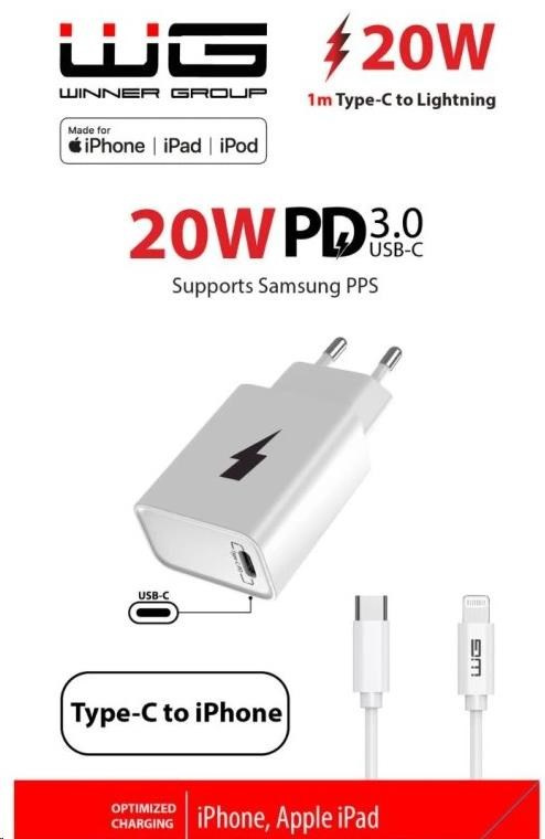 WG - Síťová nabíječka 1x USB-C, PD 20W + kabel Type-C na Lightning MFI, white