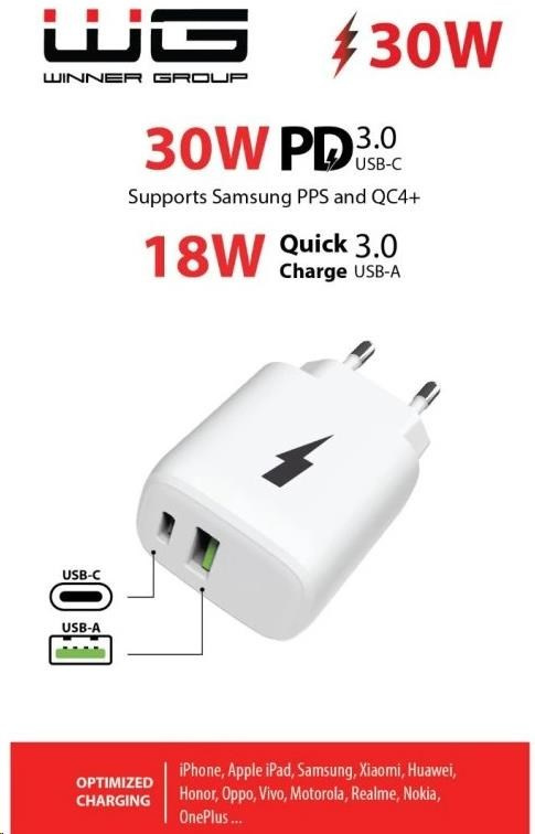 Podporuje Power Delivery 3.0 s výkonem 30W pro ultrarychlé nabíjení kompatibilních zařízení, včetně nejnovějších modelů iPhonů, iPadů, Samsung Galaxy a dalších. Dynamická technologie PPS (Programmable Power Supply) optimalizuje napětí a proud podle potřeb vašeho zařízení. Dále technologie rychlého nabíjení QC4+ je vyvinutá společností Qualcomm, která zajišťuje rychlé, efektivní a bezpečné nabíjení kompatibilních zařízení. Umožňuje současné nabíjení dvou zařízení bez ztráty výkonu.
